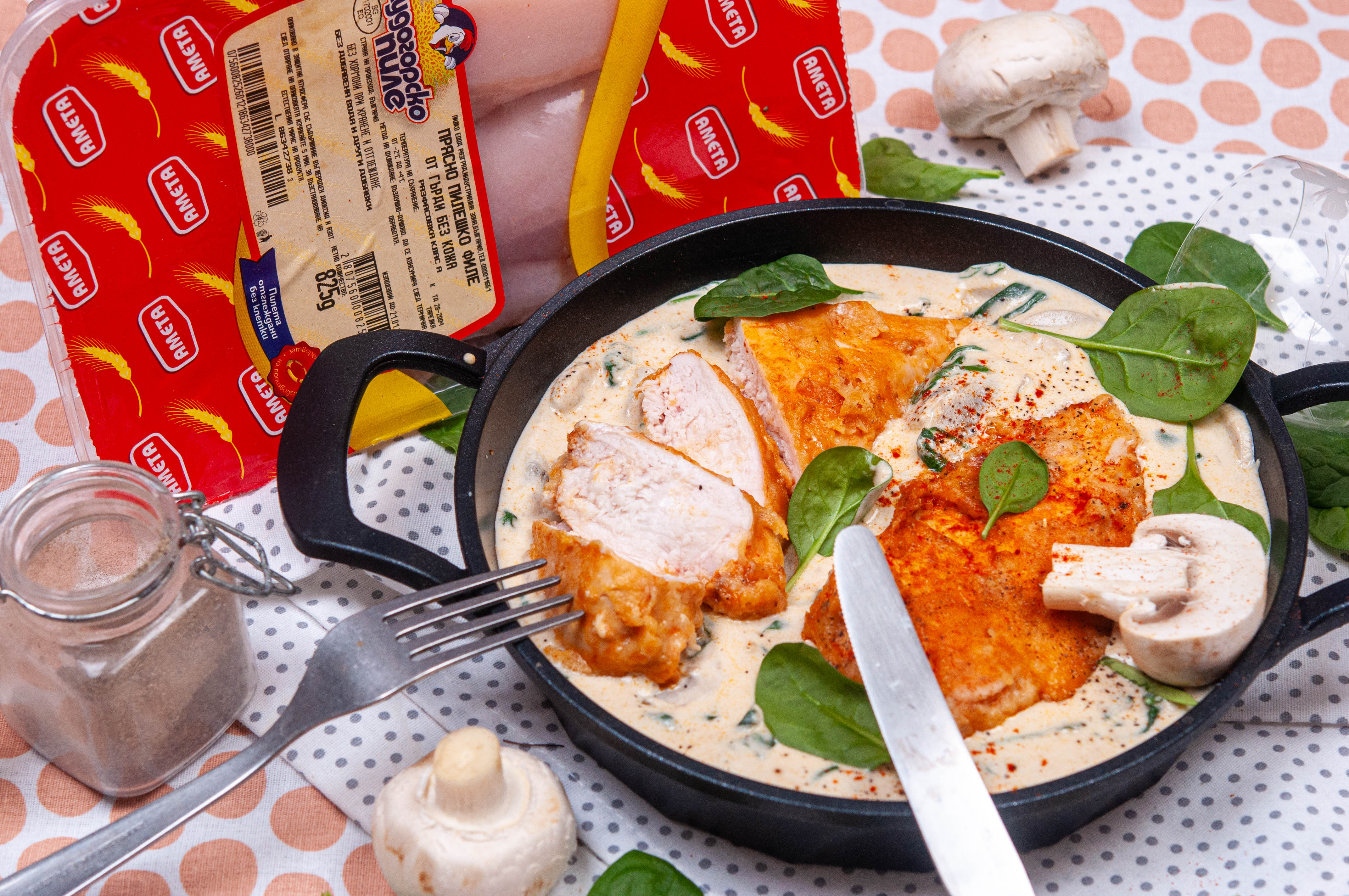 Рецептата за пиле с гъби, спанак и сметана на тиган е изпълнена.