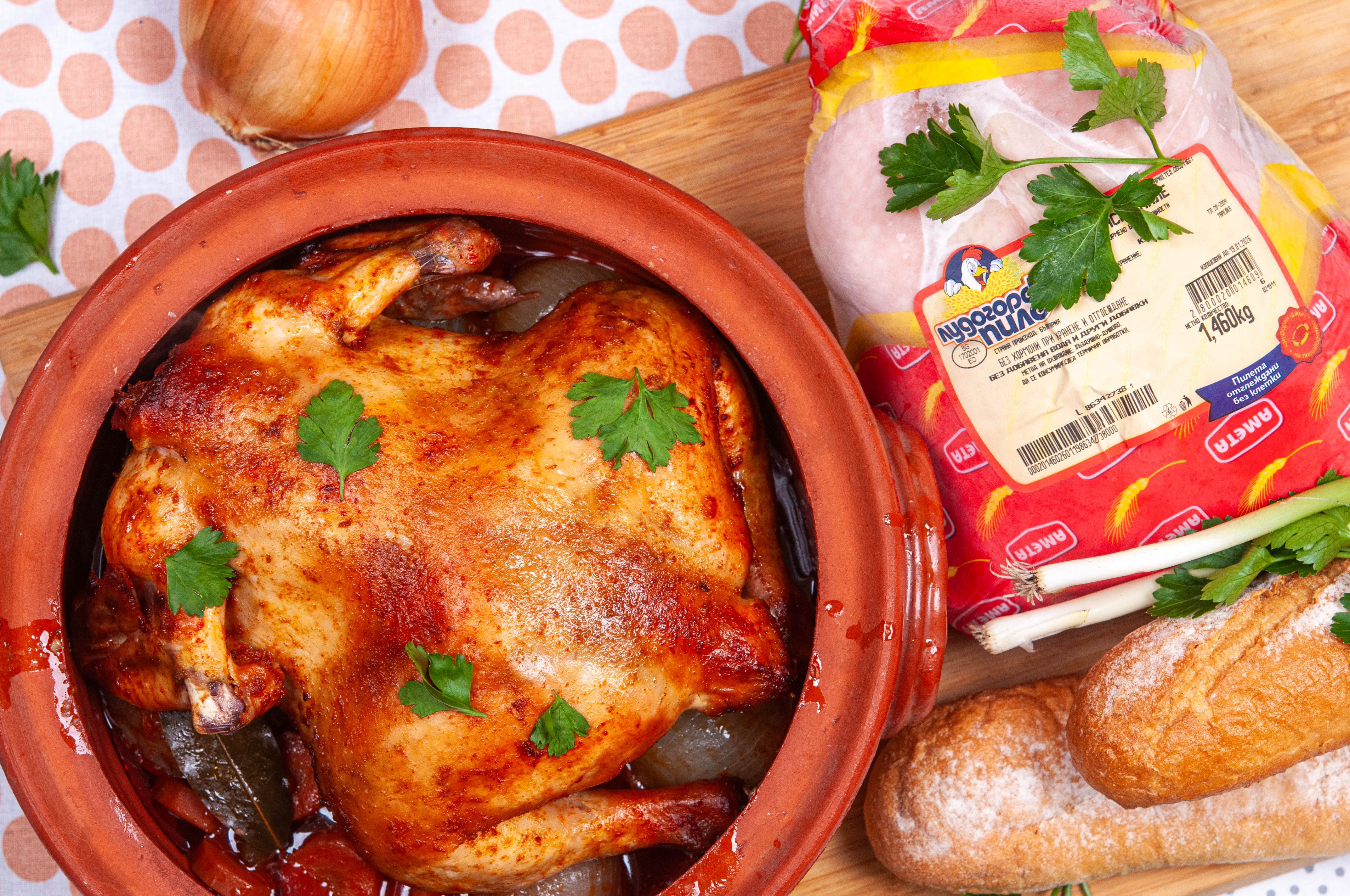 В класическата българска кухня, има разбиране, че каквото и да сложиш и да сготвиш в керамичен гювеч, то то ще стане много много вкусно! И това твърдение е много близо до истината. В пълна сила това важи за рецептата за пиле попска яхния в гювеч. Попската яхния има своите вариации, като в основата ѝ е голямото количество лук, който чудесно се комбинира с пилешкото месо. Подобно на всички рецепти приготвени в гювеч и тази рецепта се приготвя много лесно, аз резултатът - богат като вкус и аромат. Може да приготвите пилето попска яхния само с пилешки бутчета, но много по-ефектно, а и по-разнообразно се получава ястието, когато е приготвено с цяло пиле, защото всеки може да избере предпочитаното от него парче пилешко. Залагаме на цяло охладено пиле от Лудогорско пиле, което освен че е много вкусно и с доказан произход е и подходящо като размер и се побира идеално в гювеча.