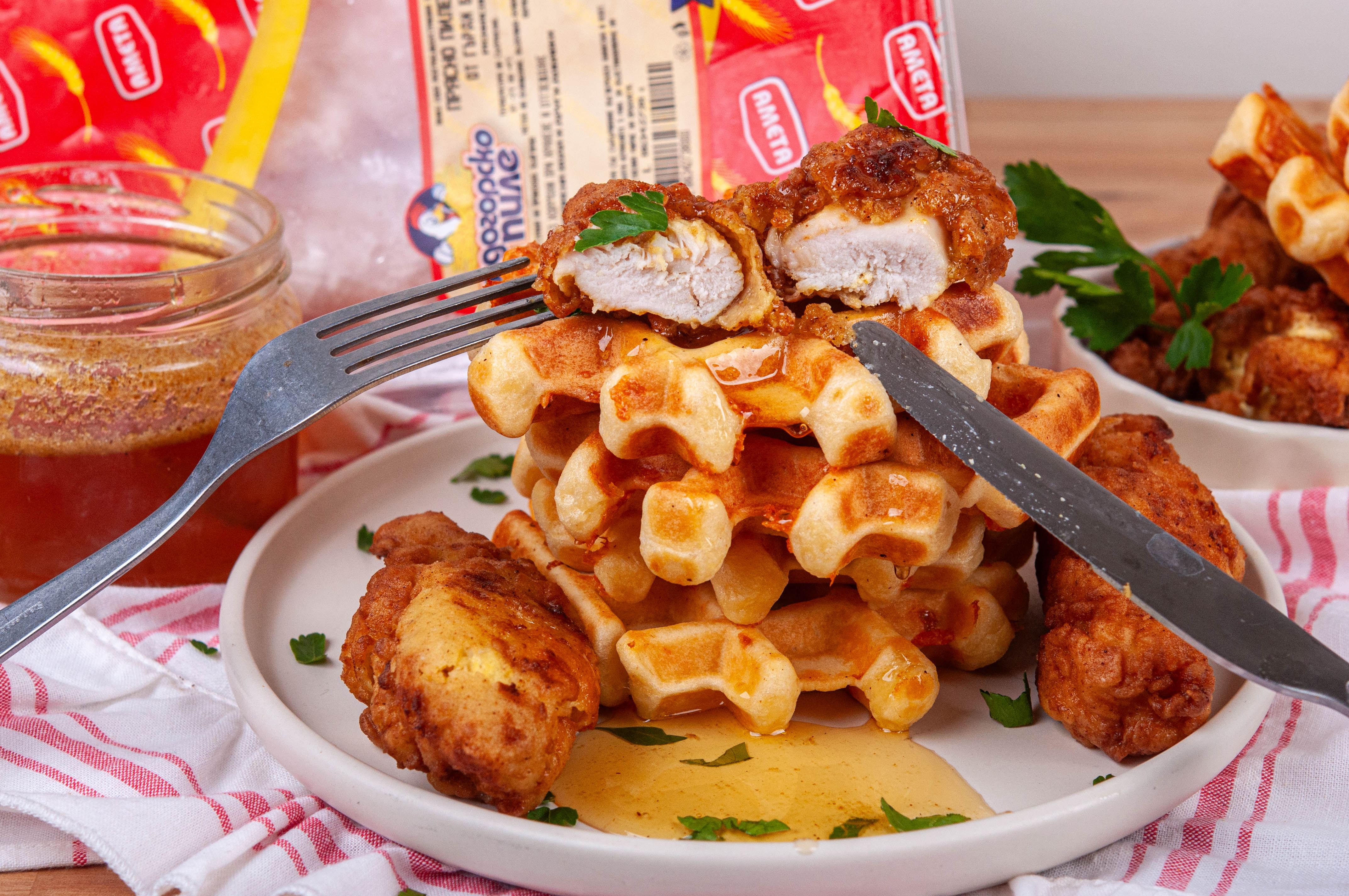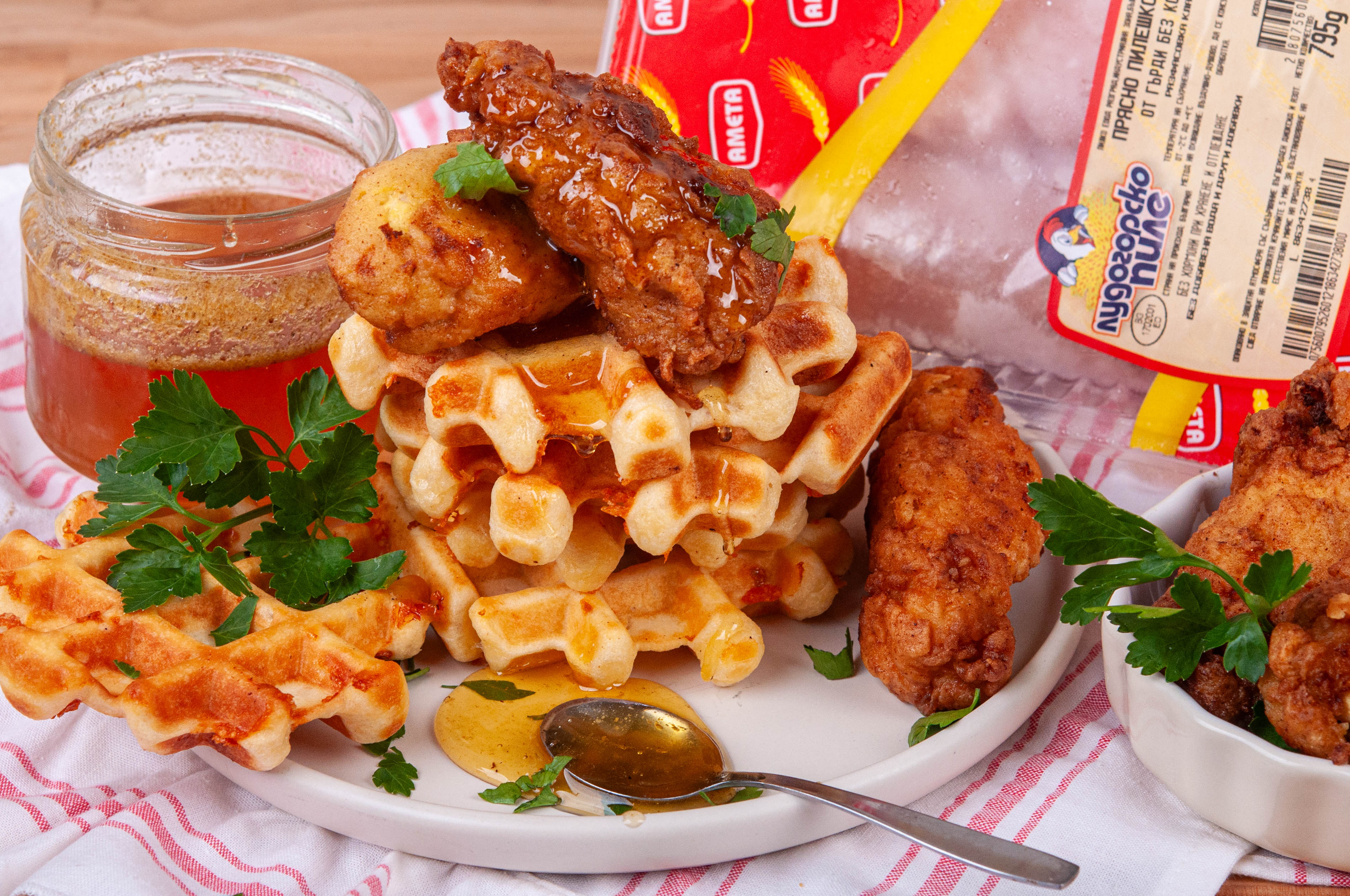 Комбинирането на елементите на рецептата за солени гофрети с хрупкаво пиле с меден сос звучи малко изненадващо. Изненадващо за българския вкус, но класически и добре познато за други места по света. Много ефектна и много вкусна като резултата, рецептата за солени гофрети с хрупкаво пиле с меден сос е чудесна идея за пищна закуска, която е особено подходяща и за брънч-менюто. Разбира се, за да получим едновременно вкусно и сочно пиле, трябва да използваме качествено пилешко филе, каквото е пилешкото филе от Лудогорско пиле.