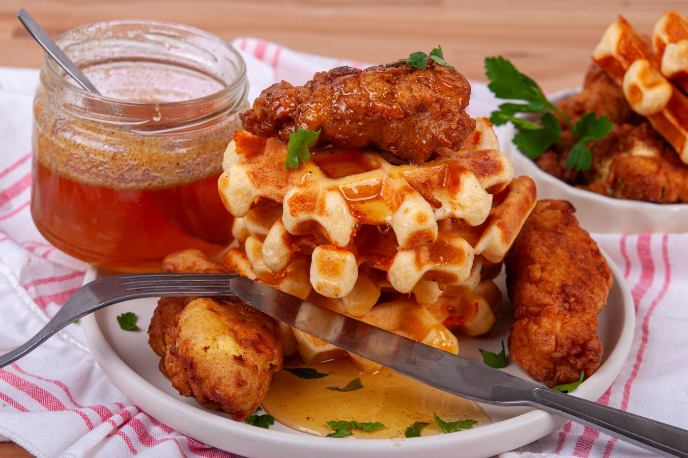 - В голяма голяма плоска чиния разбърквате брашното, заедно с подправките. В малка тенджерка сгорещявате олиото много добре, така че врящата мазнина да е поне 3 пръста. Парчетата пиле махате от маринатата, овалвате в сместа с брашното, пак леко потапяте в маринатата и отново в брашното, след което пържите за по 3-4 минути от всяка страна до придобиване на златист цвят, като след което е най-добре да изстине върху скара, за да остане хрупкаво. За медения сос разбърквате меда с чили соса до хомогенност. Сервирате гофретите, като поставите върху тях пържено пиле полято с медения сос.