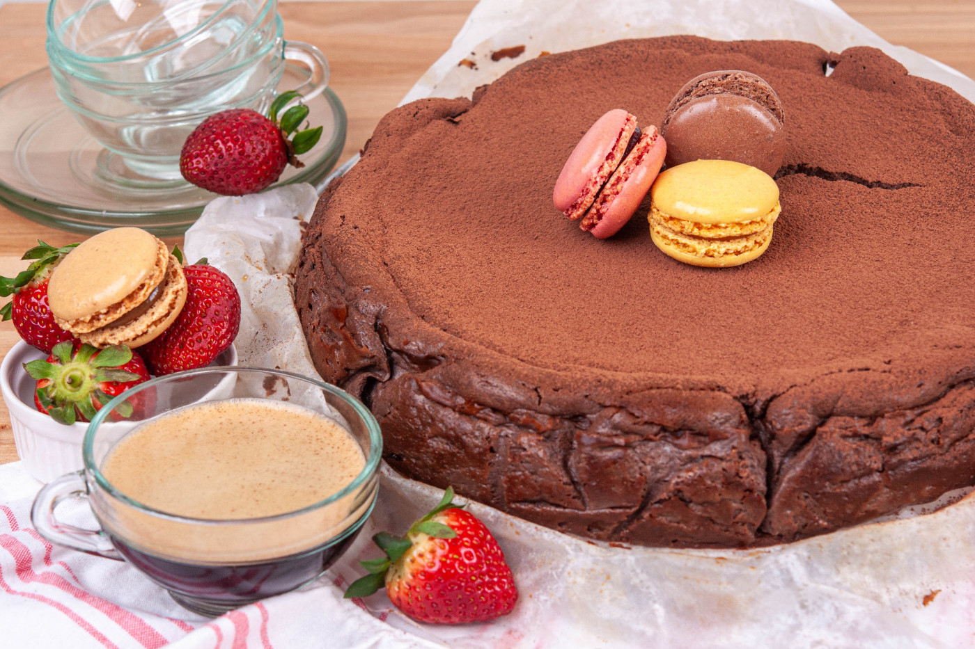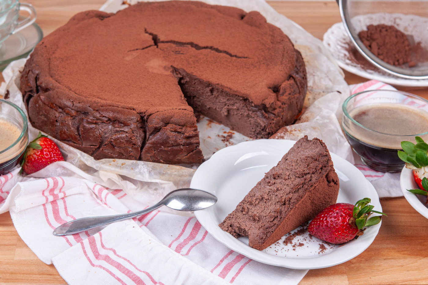 - За да получите фин сладкиш е най-добре изсипвайки сместа във формата за печене да я прецедите през цедка. Шоколадовият чийзкейк Сан Себастиан печете в предварително загрята на 220 градуса фурна за 30 минути. След като чийзкейкът е изпечене трябва да изстине напълно, затова е добре да го оставите да се охлади за 3-4 часа, а най-добре за една нощ. Преди сервиране поръсвате по желание с натурално какао и украсявате с плодове.