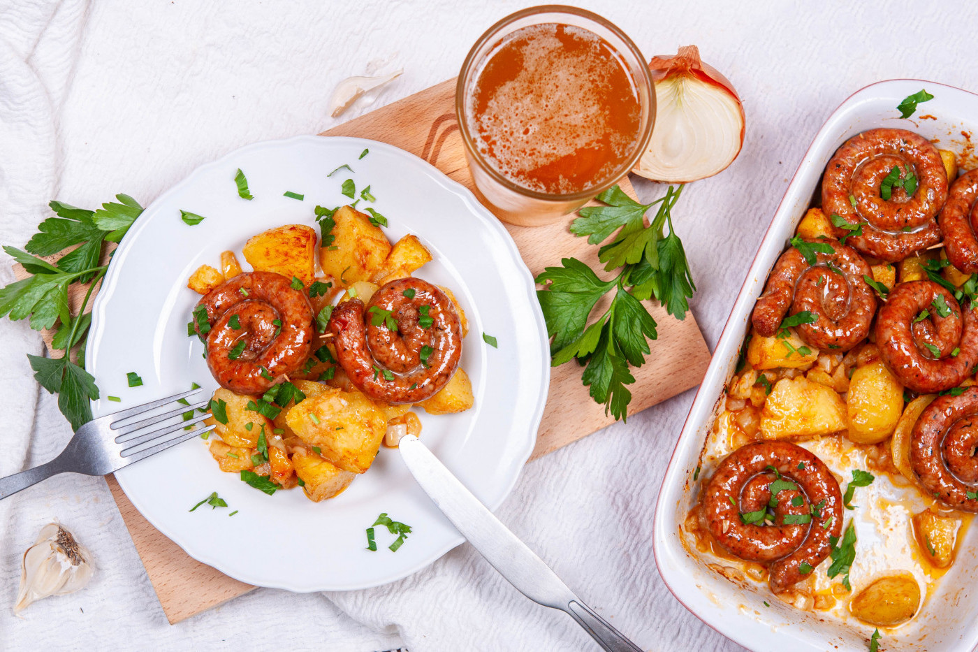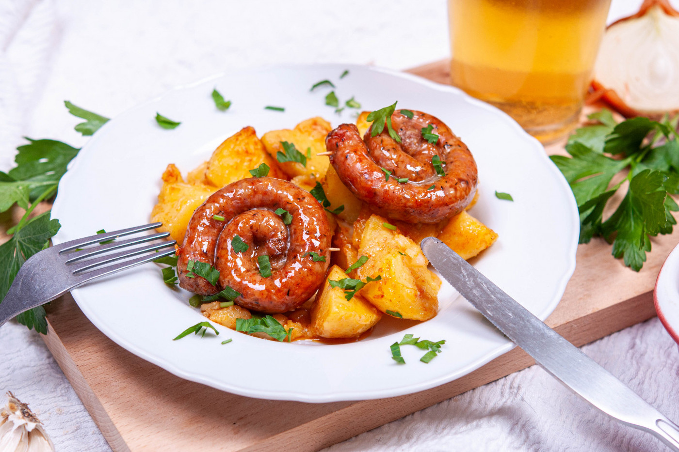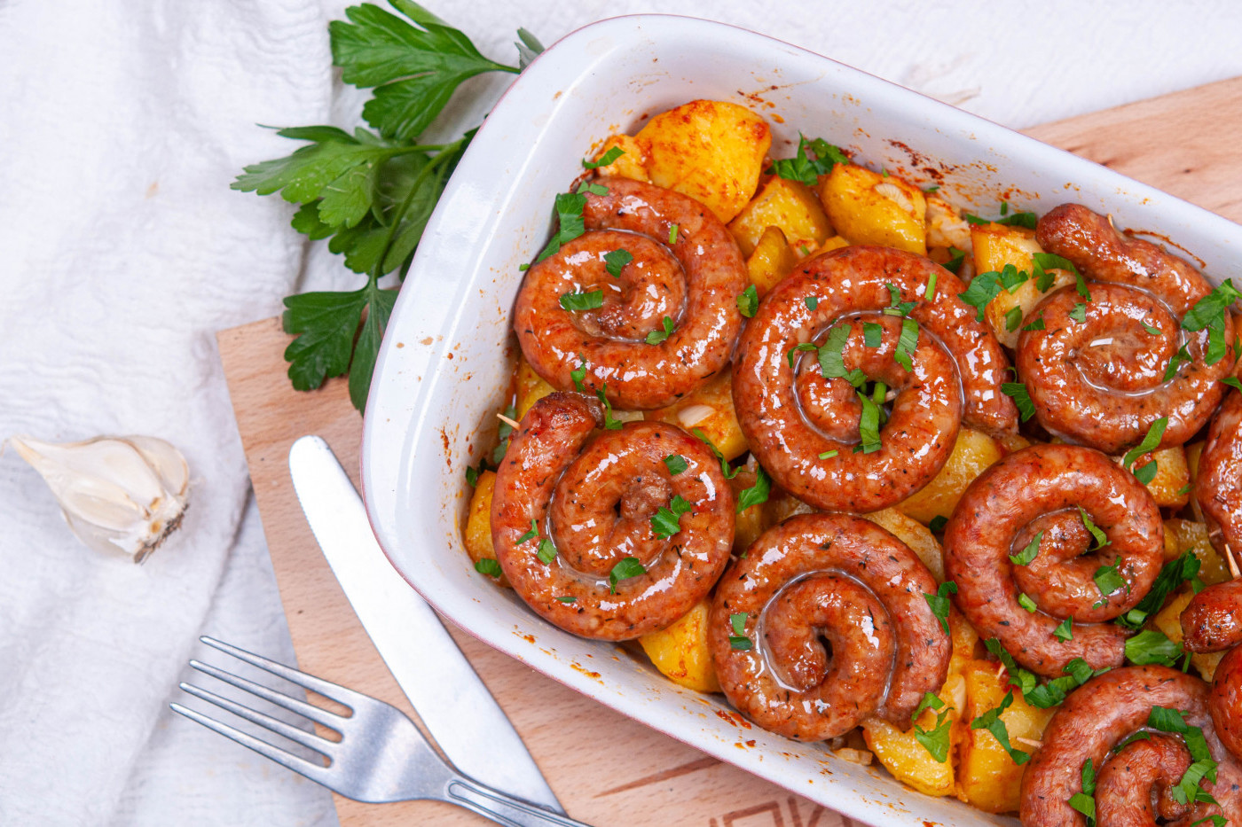 - Нарежете карначето на парчета, които завийте на колелца и ги бучнете с клечка за зъби така че да не се развият по време на печене. Наредете колелцата карначе върху картофите и печете в предварително загрята на 180 градуса фурна, докато карначетата са напълно изпечени. Преди сервиране поръсете с прясно нарязан магданоз.